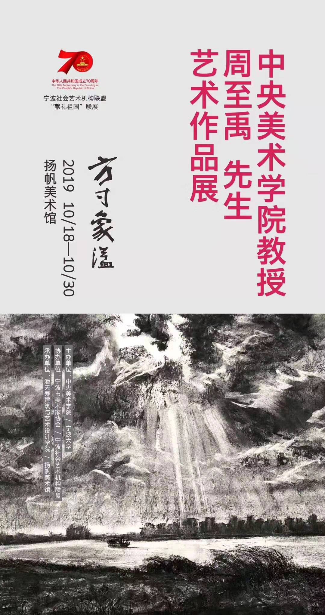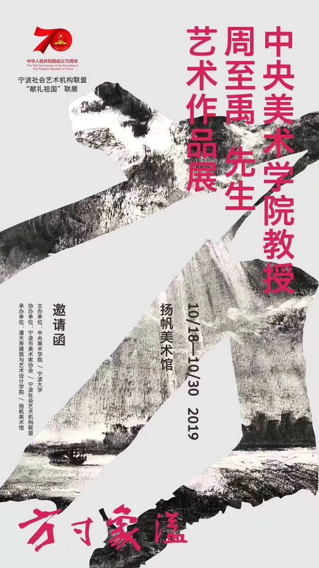 中华人民共和国成立70周年宁波社会艺术机构联盟“献礼祖国”联展——周至禹教授艺术作品展将于10月18日至10月30日在扬帆美术馆开展。现场展出周至禹教授192幅画宁大风景素描作品和78幅版画作品,诚邀您前去观展。