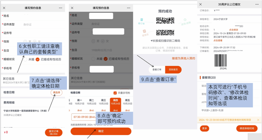 1.请各单位负责通知本部门的教职工到事先选定的体检中心体检,原则上不得更改体检地点。请提前进行微信预约或电话预约,并在预约日期当天进行体检。如因故不能在预约当天参加体检,请在手机“订单页”最下方“修改体检时间”或拨打前台电话(外滩院区:0574-87035370;方桥院区:0574-87086039)取消预约后,再择期预约体检。