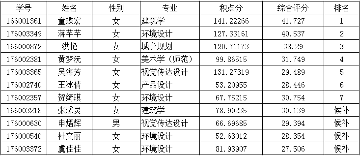 各位老师、同学: 根据《关于印发<调教 关于推荐接收免试攻读硕士学位研究生工作管理办法>的通知》(宁大政【2019】107号)文件精神,完成推荐接收免试攻读硕士学位研究生工作。根据学校下发的7个名额,按照各专业综合评分确定推荐顺序,1:1.5的比例在推免平台中予以推荐。现将2021年潘天寿建筑与艺术学院拟推荐免试攻读硕士学生名单公示如下: