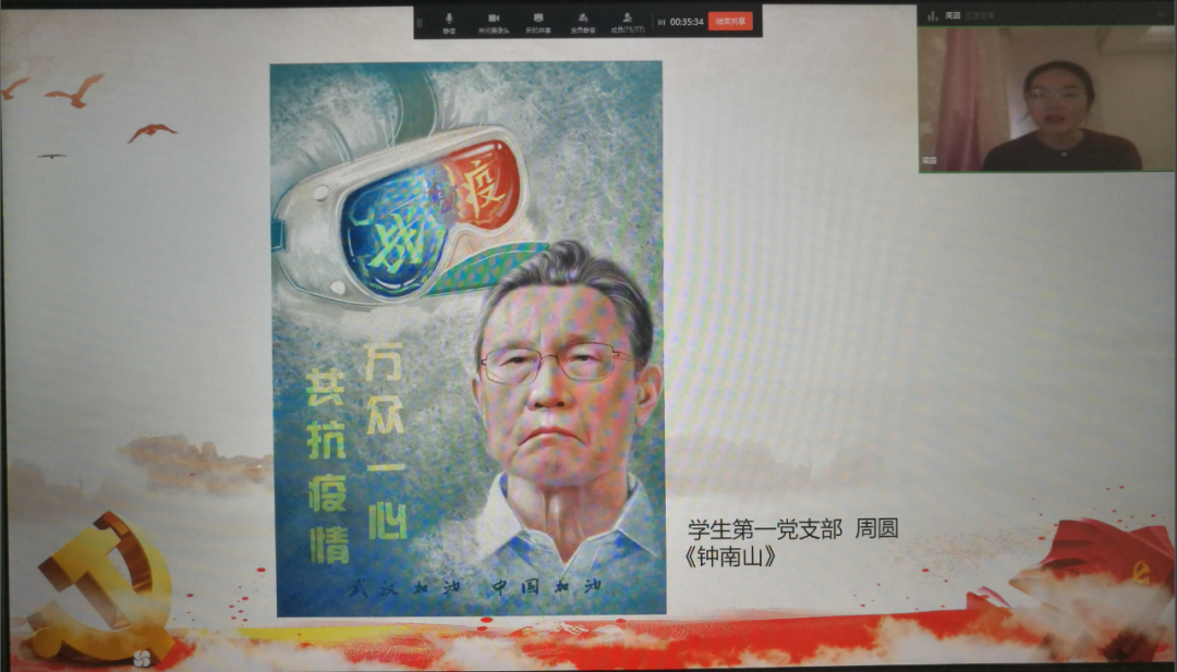 随后,集中展示了学生党员的“以艺抗疫”作品,学生党员代表分享了创作感悟。学生第一党支部党员孙雨田用炭笔描绘出自己家门口的景象,通过疫情前后街道的对比,绘出了疫情的严峻以及对抗疫成功的决心。学生第一党支部党员周圆描绘了抗疫英雄钟南山院士,表达了对老先生的敬佩之情,希望借此给人们带来精神鼓舞,传递必胜信念。学生第一党支部党员朱佳敏创作的作品直接描绘了抗疫一线穿着厚厚隔离服的医护人员们,赞颂了疫情当前,各行各业坚守岗位的人们。学生第二党支部的党员虞佳佳创作的疫情海报,将病毒想象成困兽,相信战胜疫情指日可待。