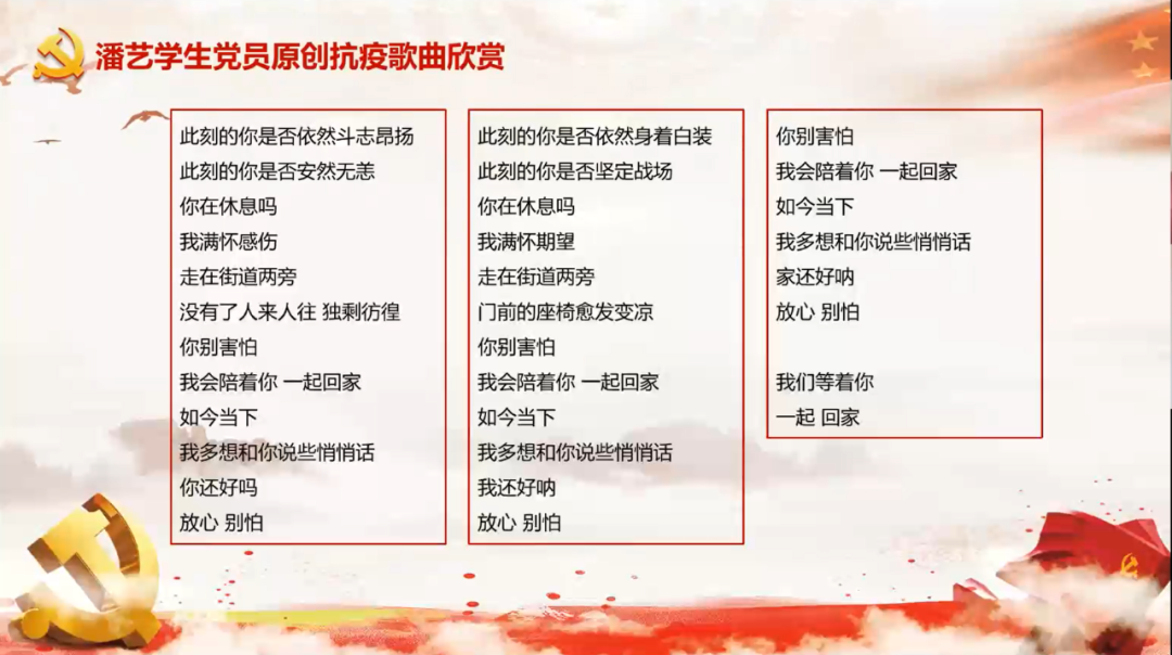 原创抗疫歌曲《一起,回家》的词作者,学生第二党支部党员王春伟为大家讲述了创作的心路历程,借由歌词创作,向远在前线抗击疫情的各界人士送上祝福,期待英雄凯旋。该原创歌曲经由调教