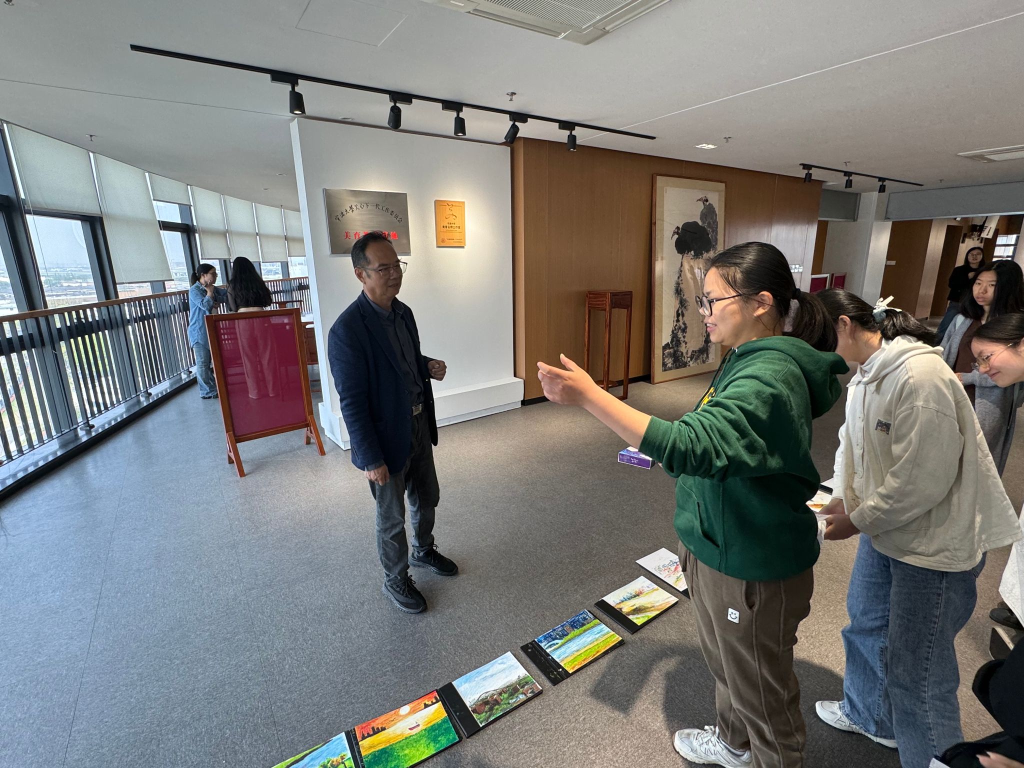 接着,周至禹教授以“情景交融——甬江风景色彩写生的体会”为题作主题讲座,分享自己多年来在学校甬江边写生体会。他指出,作为一名画家既要有理性的逻辑思维,对目之所及进行缜密的分析,又要有感性的审美判断,对自然生活进行敏感的发现。他认为绘画有三“感(敢、赶)”,一是感动,对于美的事物要有能够感动的心灵;二是敢画,绘画不要怕出丑,要勇敢地落笔,果断地绘画,方能画出好作品;三是赶紧,写生的风景每时每刻都在变化,以甬江写生为例,两岸的变化日新月异,绘画就是在记录历史,所以要赶紧画。他强调,面对AI技术对于美术的冲击,应当增强人在绘画中的存在,以人独有的情感性与偶然性来应对,同时也应当关心科技前沿与未来,以此启迪自身需要什么,从而学会设计自己,进而丰满自己,成为审美的自己。