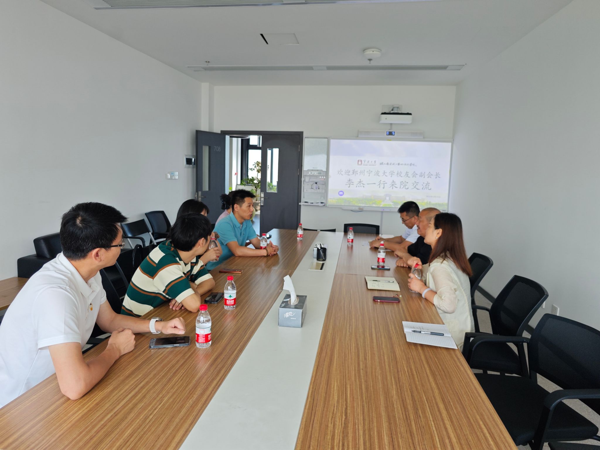 校友会副会长、宁波添腾五金科技有限公司、宁波天远天腾生物科技有限公司总经理李杰携校友会成员,宁波橙绿空间设计有限公司总经理邢锡恩、宁波希蒂文化创意有限公司总经理陈辉、宁波文旅会展集团蜂果网络科技有限公司副总经理毛际敏来院进行座谈交流。学院特聘院长徐仲偶、党委书记韩雯琛、党委副书记刘秉印,校友工作联络员吴越热情接待了校友们。