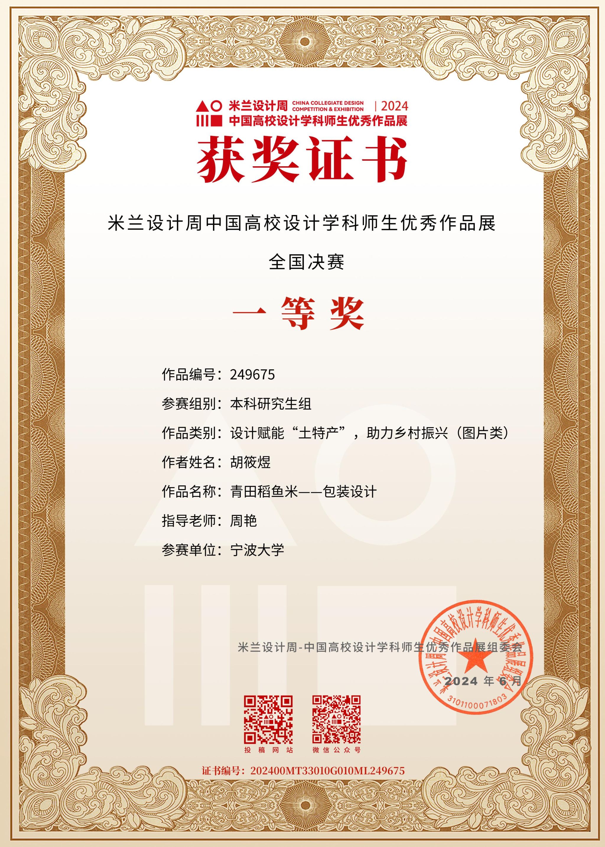 2023级艺术设计研究生胡筱煜同学的作品《青田稻鱼米——包装设计》荣获2024米兰设计周中国高校设计学科师生优秀作品展“设计赋能‘土特产’,助力乡村振兴”公益赛道全国决赛一等奖并亮相第七届中国农民丰收节。