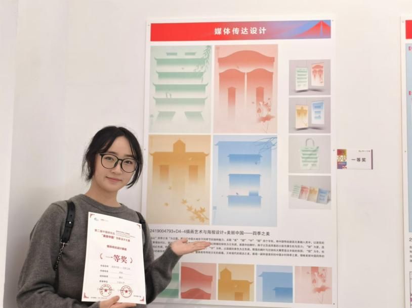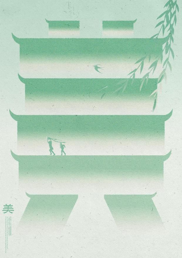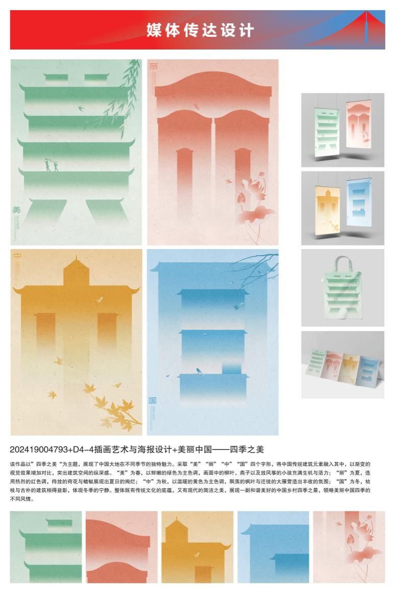 作品理念:该作品以”四季之美“为主题,展现了中国大地在不同季节的独特魅力。采取“美”“丽”“中”“国”四个字形,将中国传统建筑元素融入其中,以渐变的视觉效果增加对比,突出建筑空间的纵深感。“美”为春,以鲜嫩的绿色为主色调,画面中的柳叶、燕子以及放风筝的小孩充满生机与活力;“丽”为夏,选用热烈的红色调,待放的荷花与蜻蜓展现出夏日的绚烂;“中”为秋,以温暖的黄色为主色调,飘落的枫叶与迁徙的大雁营造出丰收的氛围;“国”为冬,枯枝与古朴的建筑相得益彰,体现冬季的宁静。整体既有传统文化的底蕴,又有现代的简洁之美,展现一幅和谐美好的中国乡村四季之景,领略美丽中国四季的不同风情。