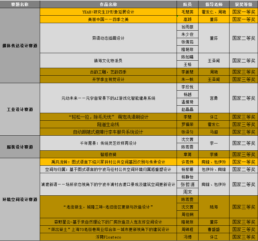 据比赛官方统计,环境空间设计赛道共收到1942份有效参赛作品,一共确定463组团队晋级决赛,其中一等奖39组,二等奖92组,三等奖332组。服装与服饰设计赛道共收到539份有效参赛作品,142组团队晋级决赛,其中一等奖14组,二等奖43组,三等奖85组;工业产品设计赛道共收到1430份有效参赛作品,一共确定310组团队晋级决赛,其中一等奖30组,二等奖70组,三等奖210组;媒体传达设计赛道共收到2249份有效参赛作品,最终确定512组团队晋级决赛,一等奖45组,二等奖112组,三等奖335组。