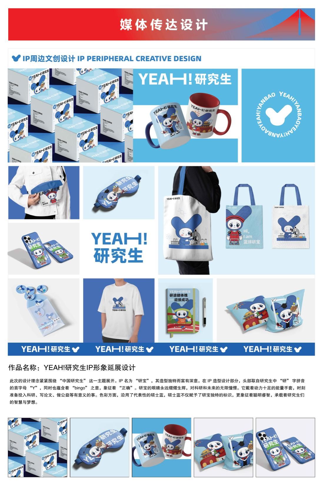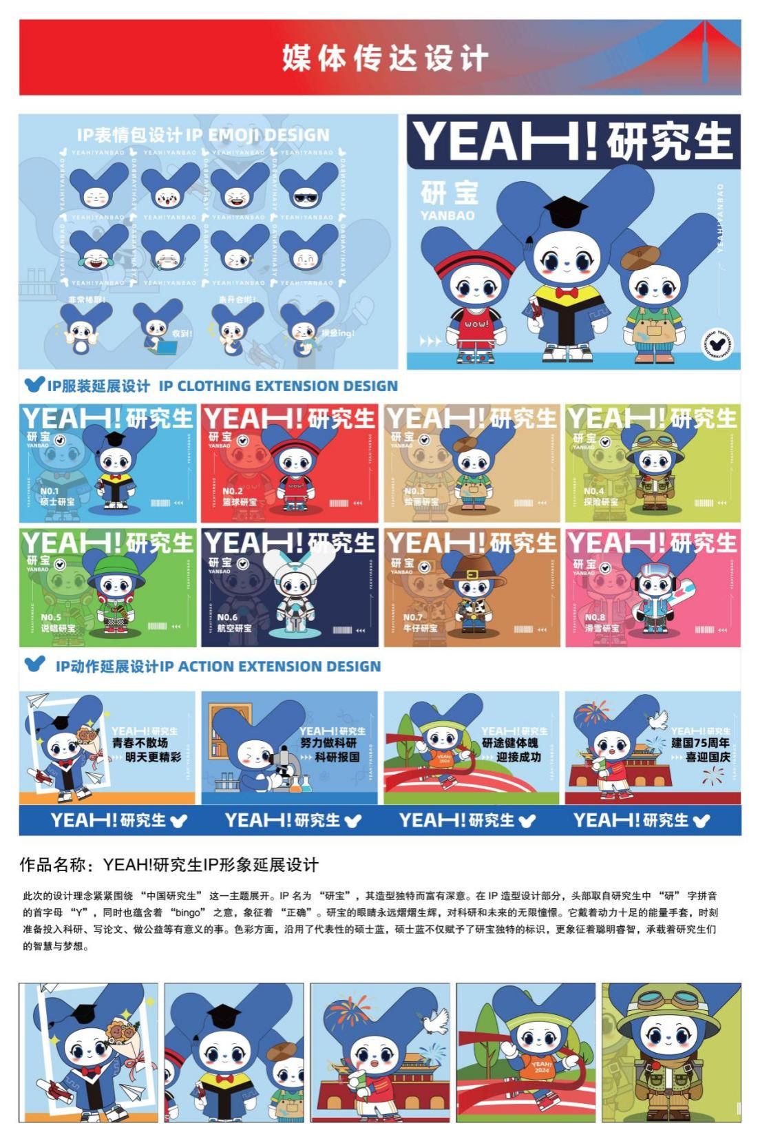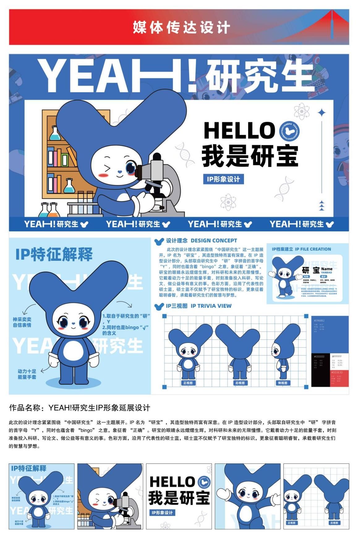 作品理念:设计说明:此次的设计理念紧紧围绕“中国研究生”这一主题展开。IP 名为“研宝”,其造型独特而富有深意。在 IP 造型设计部分,头部取自研究生中“研”字拼音的首字母“”,同时也蕴含著“bingo”之意,象征着“正确”。研宝的眼睛永远熠熠生辉,对科研和来来的无比憧憬。它戴着动力十足的能量手套,时刻准备投入科研、写论文、做公益等有意义的事。色彩方面,沿用了代表性的硕士蓝,硕士蓝不仅赋予了研宝独特的标识,更象征着聪明睿智,承裁着研究生们的智慧与梦想。