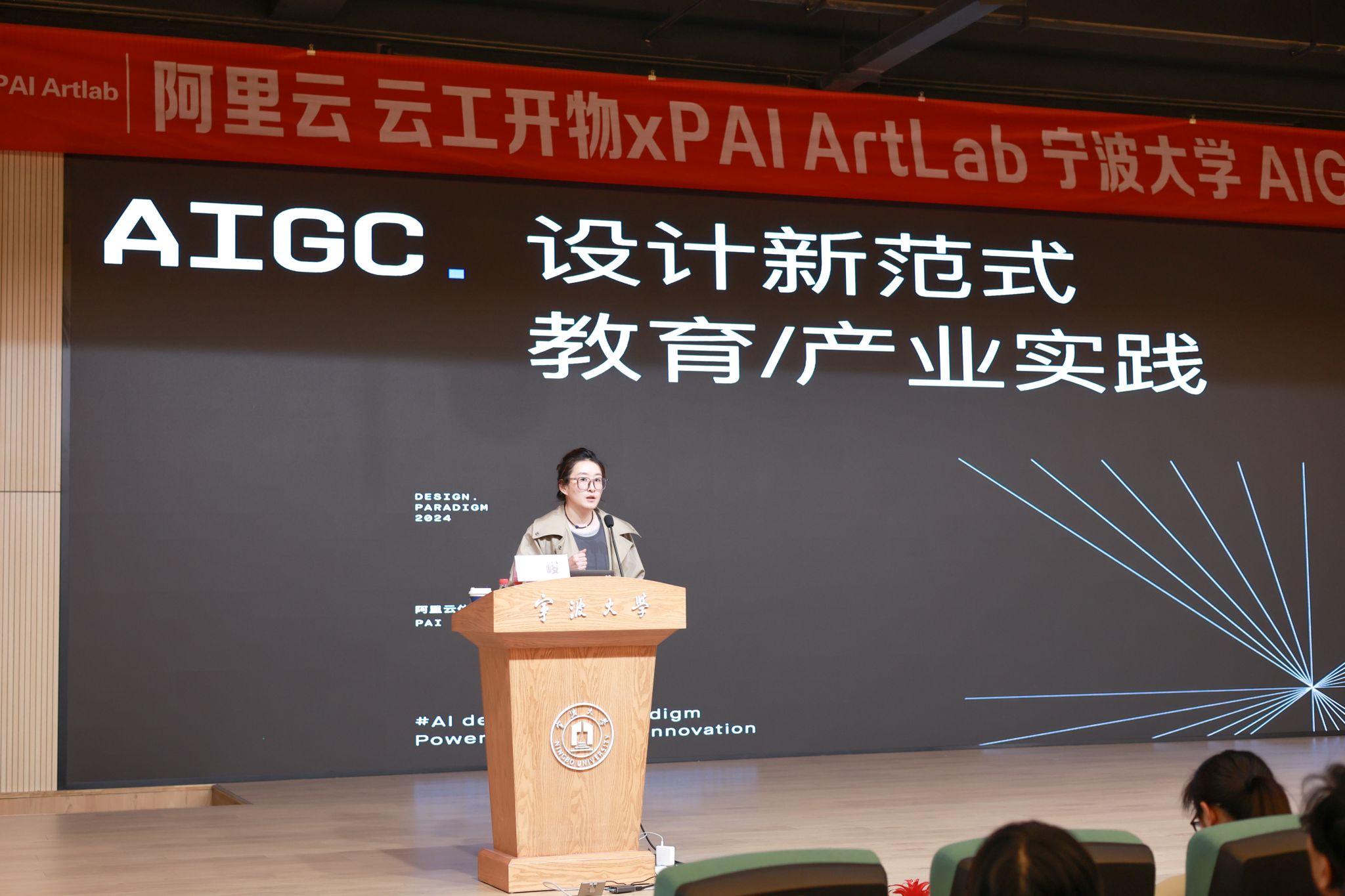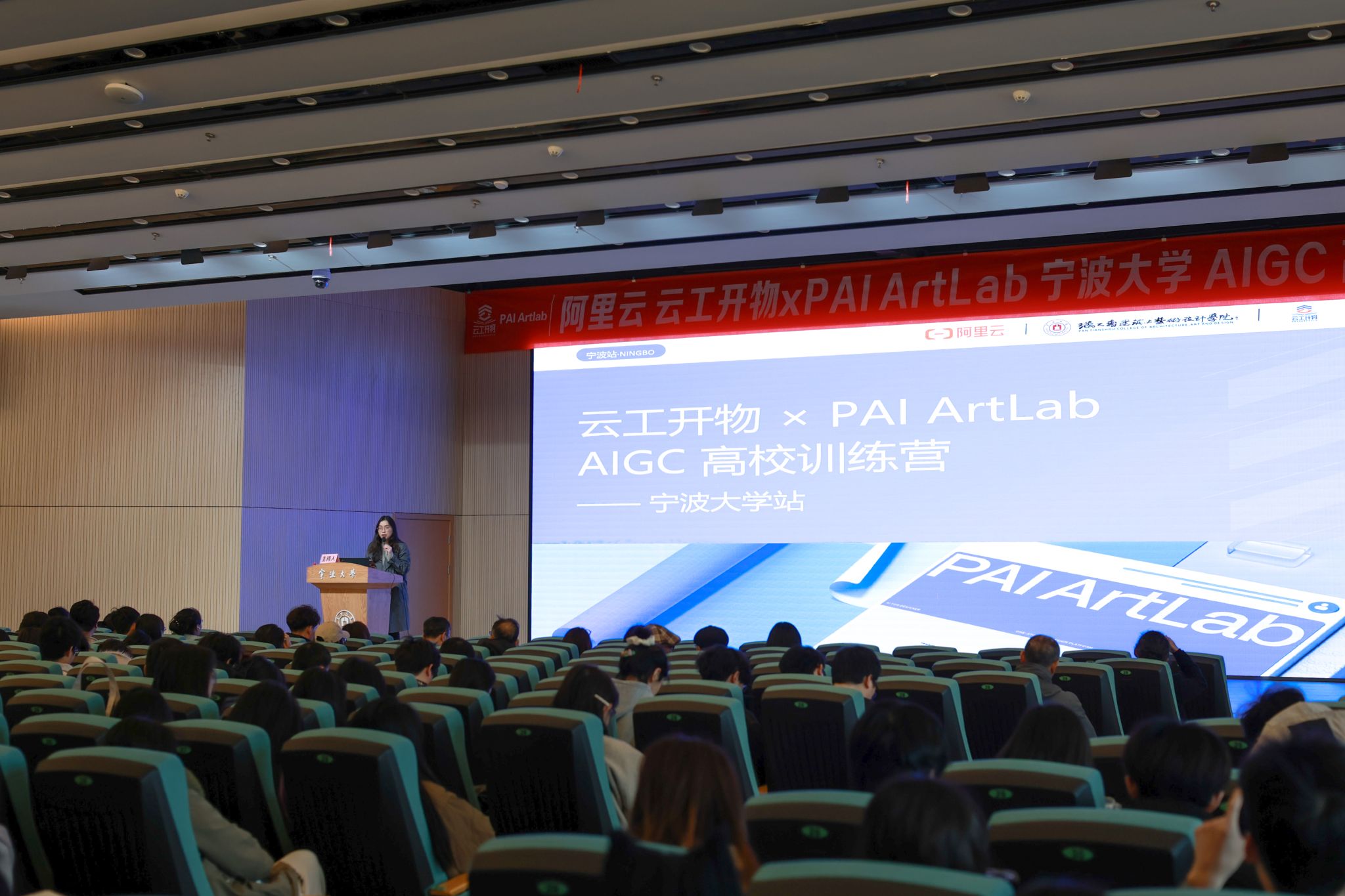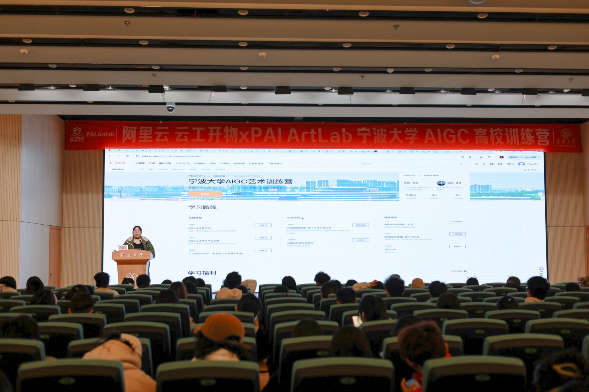 第一部分讲座结束后,阿里云高校合作专家、云工开物高校 AI + 课程负责人范唯媛为同学们简要介绍了平台的使用方法。在活动现场,阿里云团队为参与师生发放了算力资源包,并开通线上艺术训练营通道,助力学生实践 AI 设计。