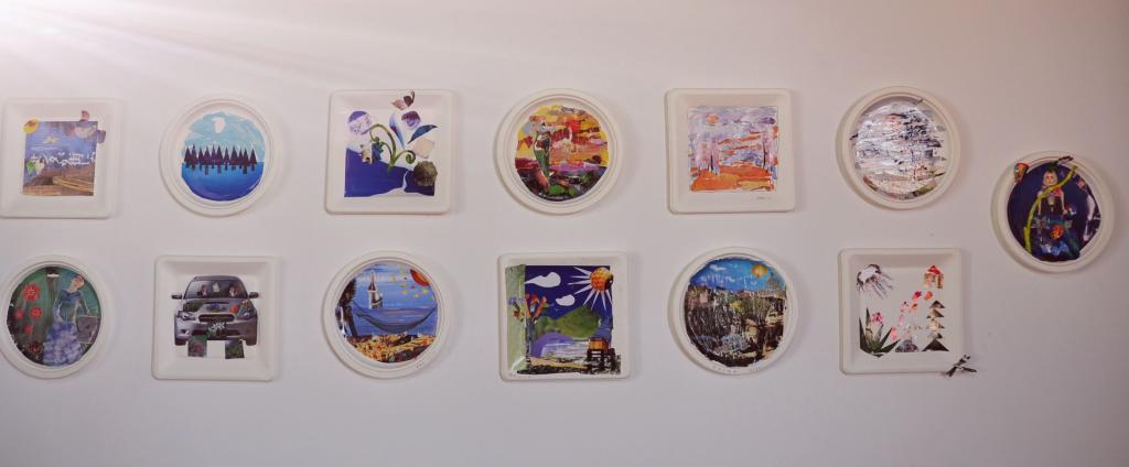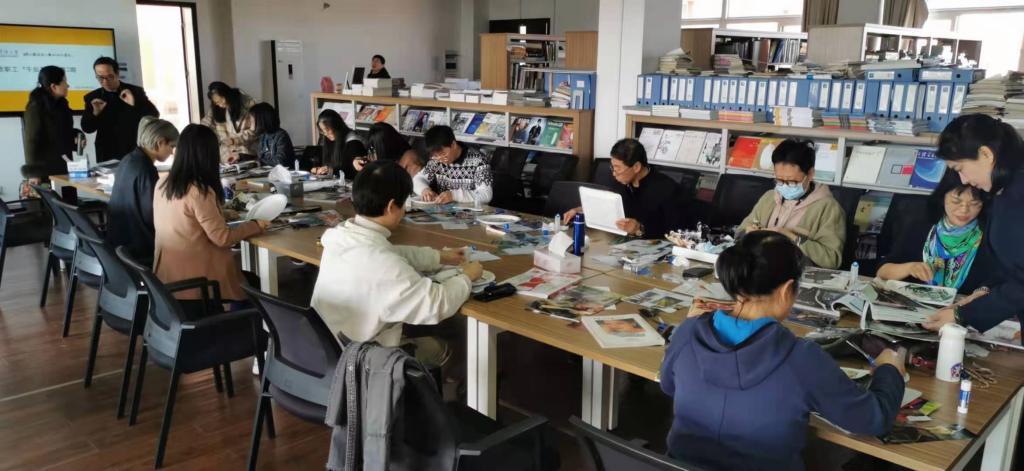 活动现场,周教授指导老师们围绕“太阳、白云、天空、大地”等元素,开展相关剪贴画创作;老师们按照活动主题,选择创作素材,挥剪拼接,粘贴构图,最后完成了十余幅剪贴画作品。