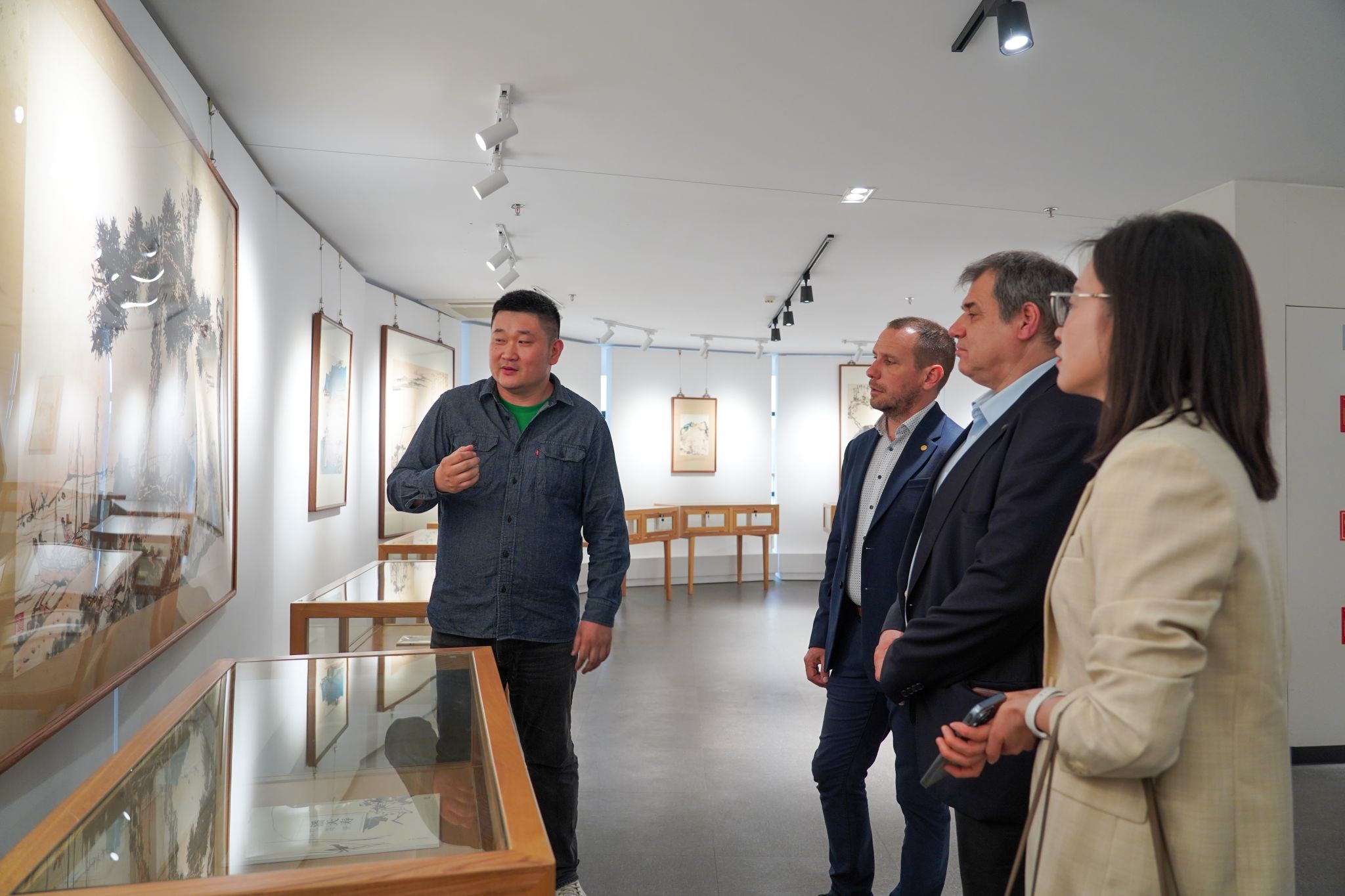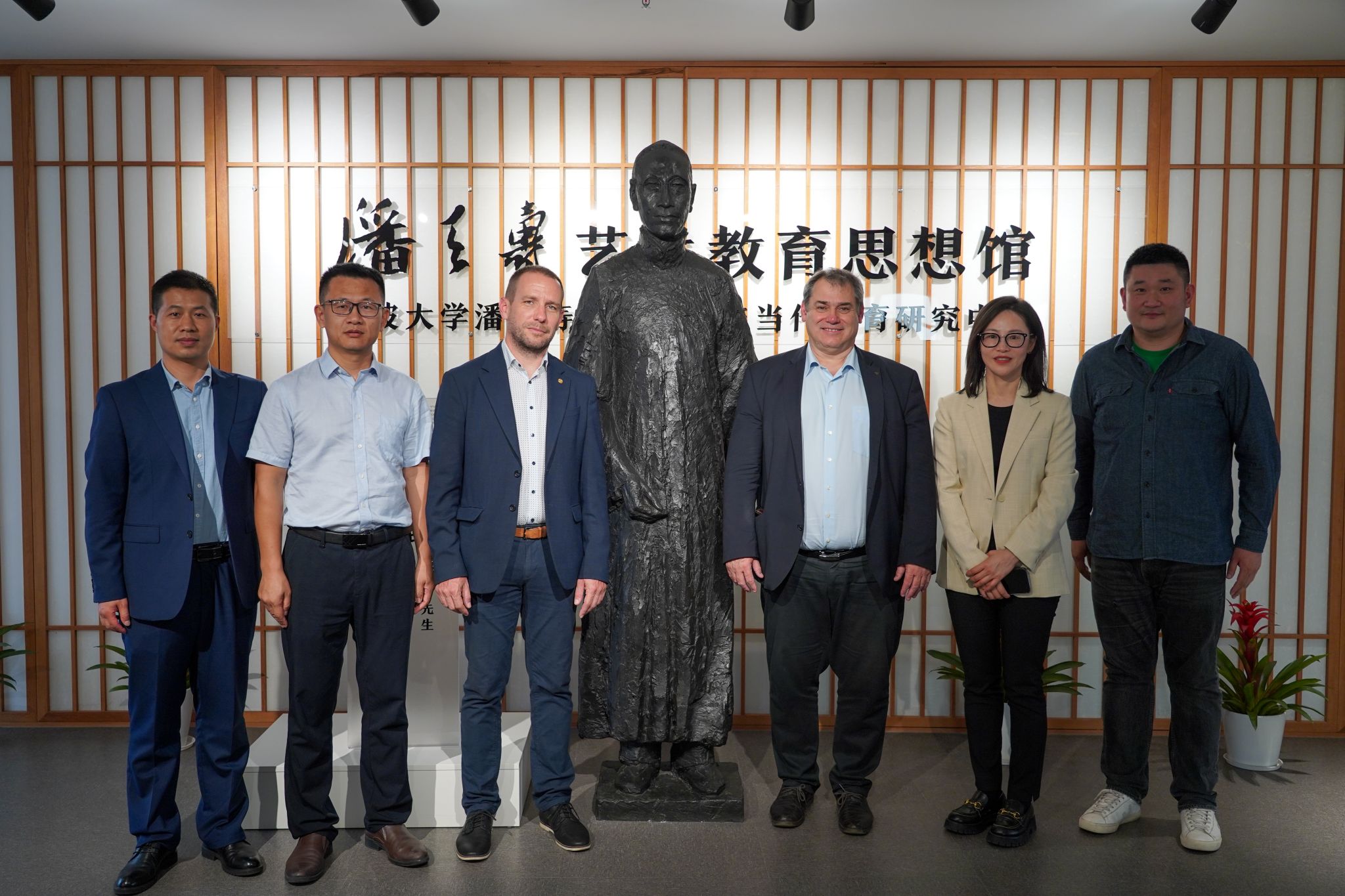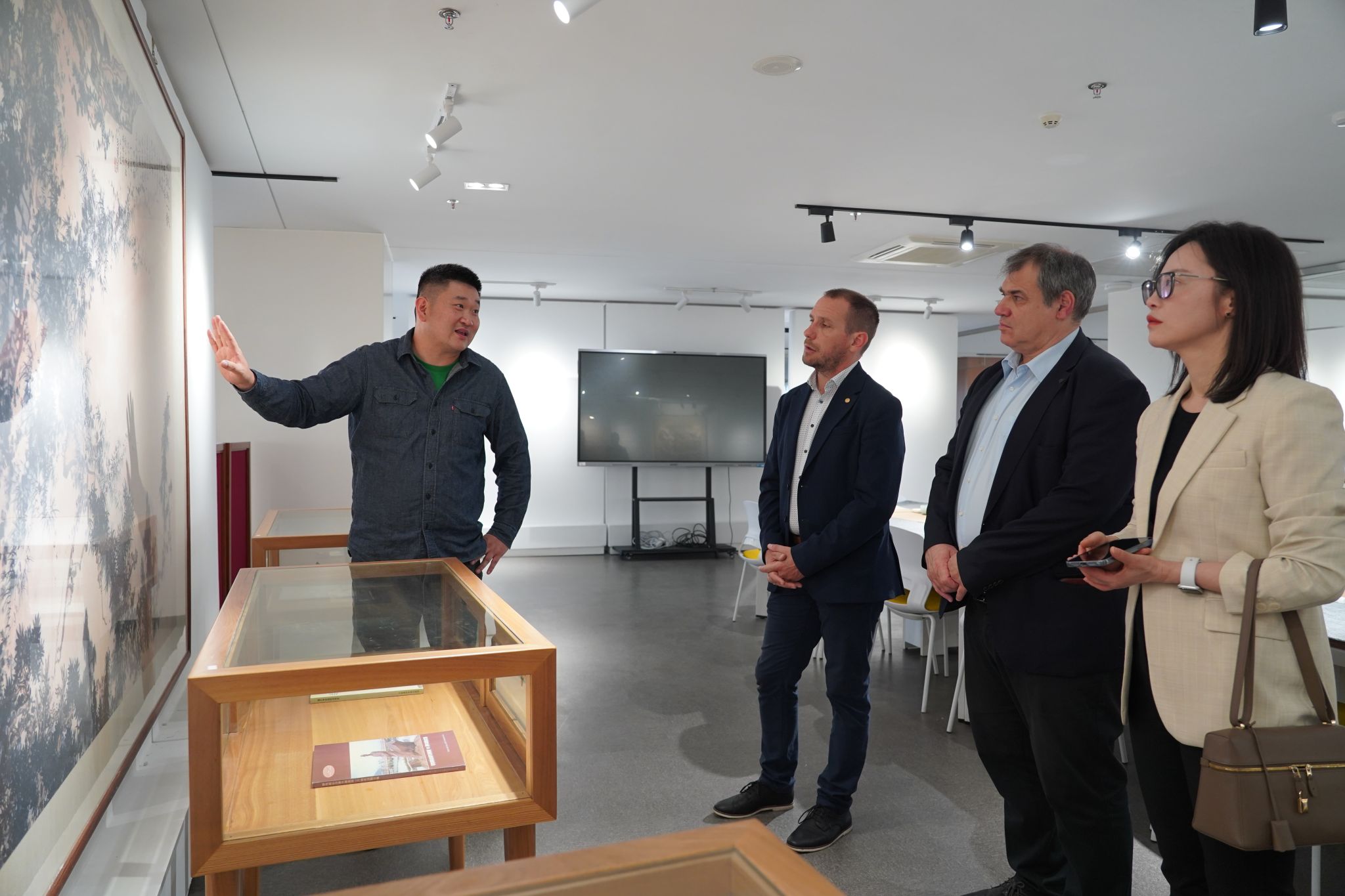 在王卓然副院长的陪同下,Hamar Imre副校长一行首先参观了位于学院9楼的潘天寿艺术教育思想馆。王院长向客人详细介绍了中国近现代艺术大师潘天寿先生的生平事迹、艺术成就及其教育理念,并重点讲解了馆内珍藏的潘天寿经典作品。代表团成员对潘天寿先生“中西融合、传承创新”的艺术思想表现出浓厚兴趣,并就中国书画艺术的独特魅力与王院长进行了交流。随后,代表团参观了学院收藏的《中国历代绘画大系》部分经典作品。Hamar Imre副校长高度赞赏这一国家级文化工程的价值,认为它不仅展现了中国传统绘画的博大精深,也为国际学者研究中华艺术提供了宝贵资源。Bartus David院长表示,罗兰大学文学院在东方文化研究领域有着深厚积累,期待未来能与我院在艺术史、文化遗产保护等方面开展联合研究。