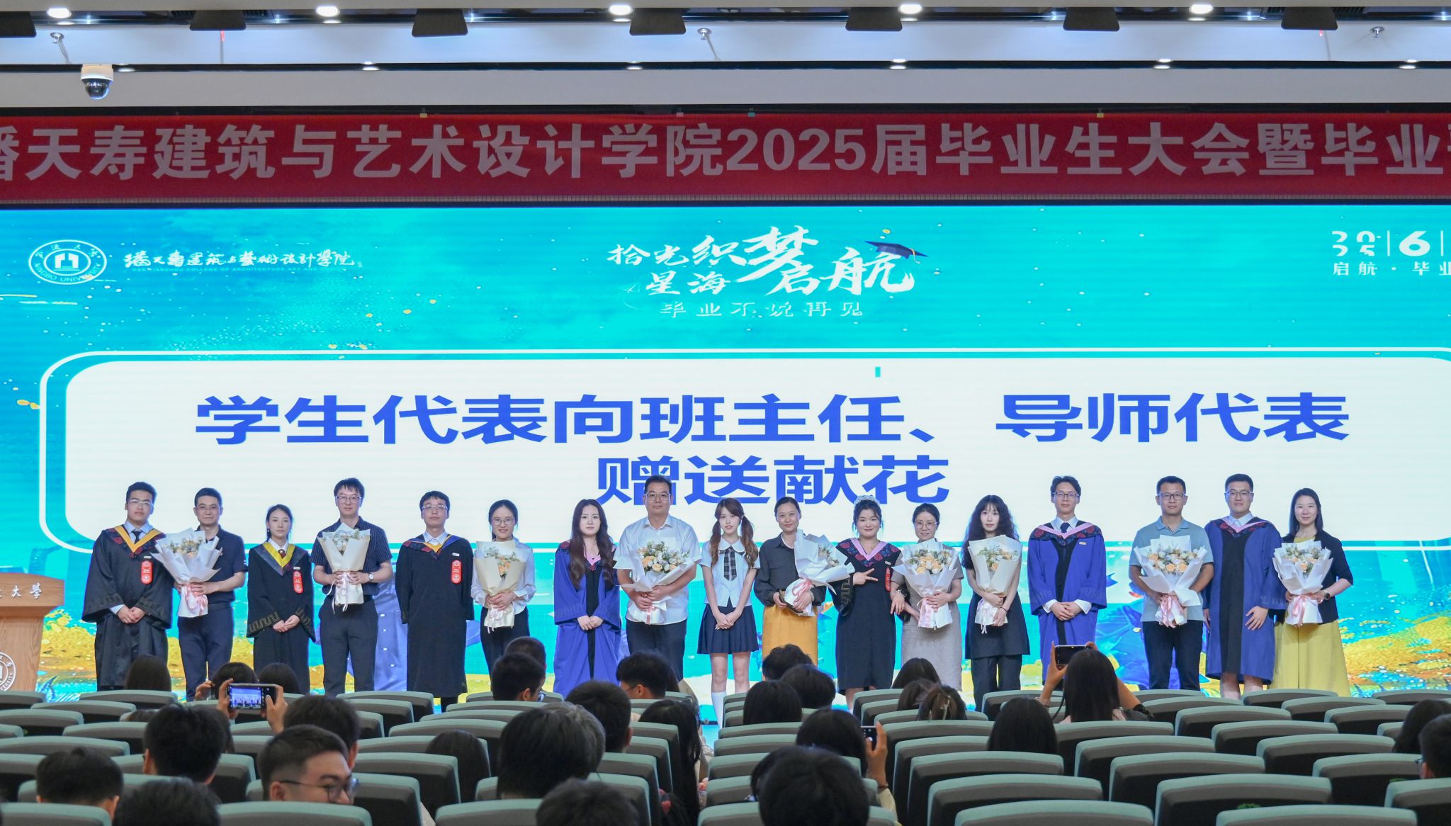 情谊交融时刻,学生代表向辛勤付出的班主任与导师代表敬献鲜花,芬芳馥郁中凝结着无尽感恩。“潘韵承风骨,艺途感师恩”,毕业生代表向学院赠送的纪念锦旗,承载着学子们对母校培育的深深感激。