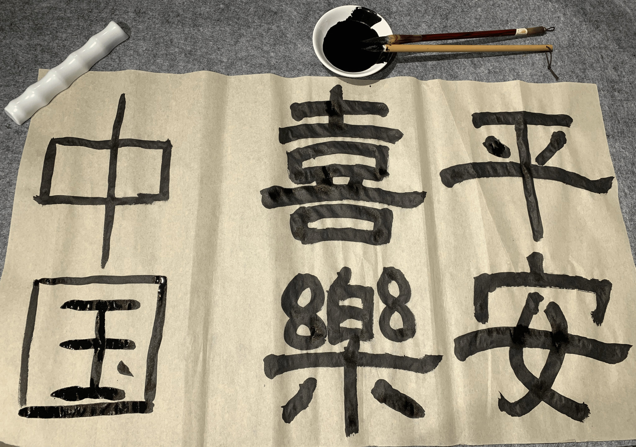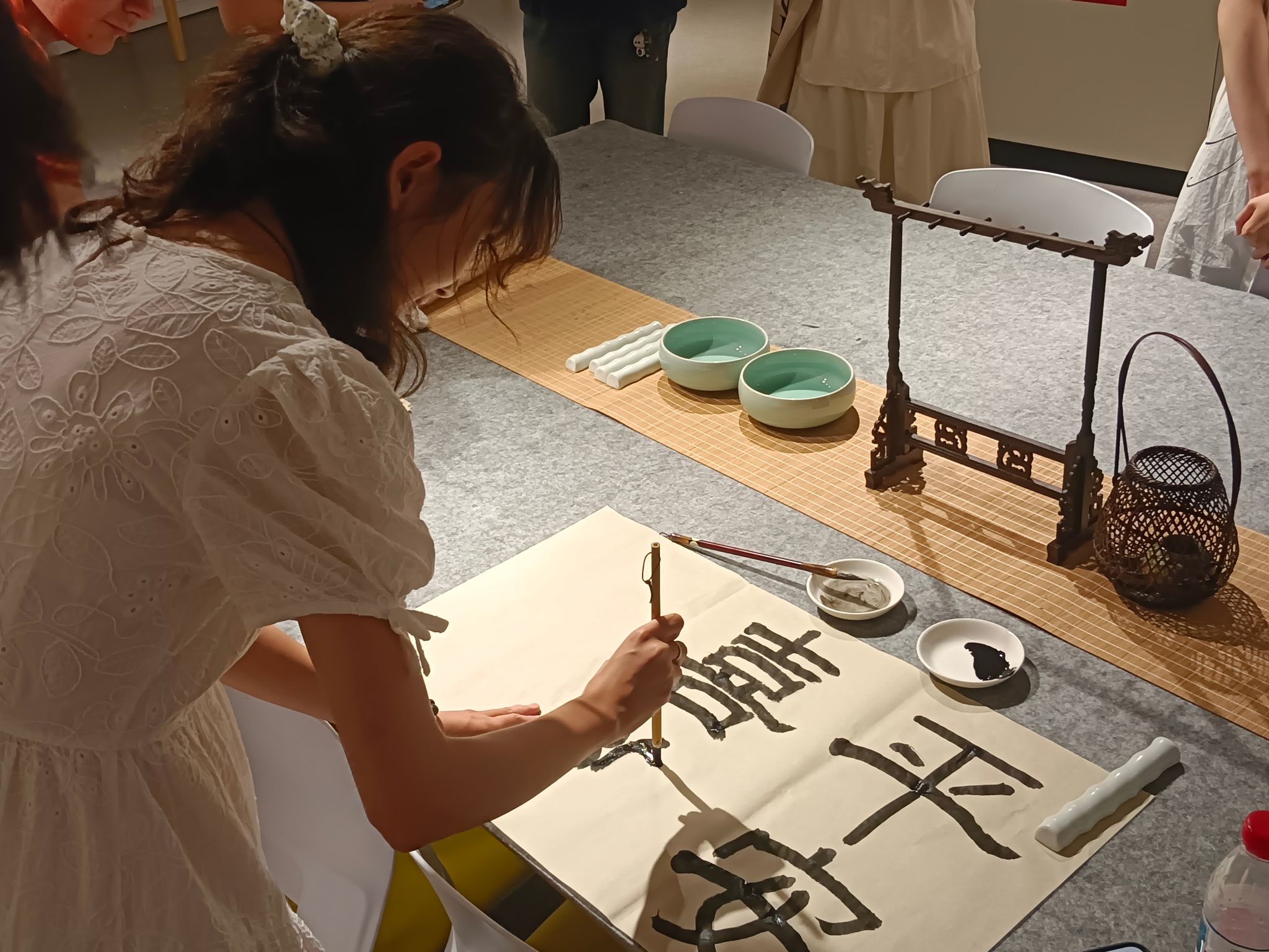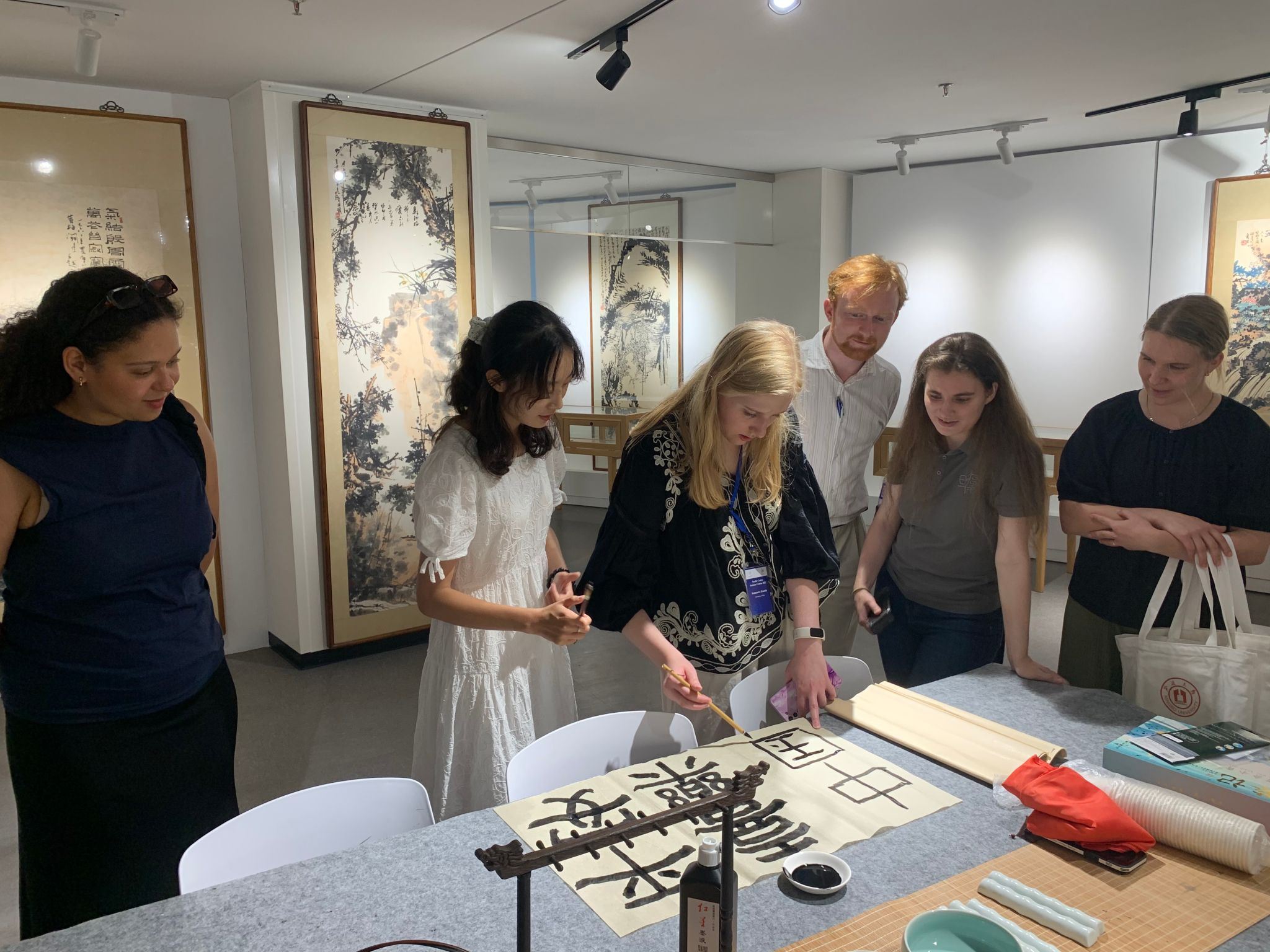活动尾声,张心怡带领同学们体验中国传统书法,挥毫写下“平安喜乐”四字,将最质朴的祝福融入笔墨之中。这份跨越语言的心意,让在场学子深受触动。随后同学们书写的“中国”二字,使得中外青年以笔为桥,在宣纸上完成了一次文化交流。