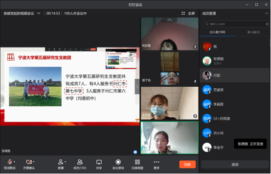 研究生支教团,讲述了自己在贵州省兴仁市第七中学支教的经历。研支团成员通过组织各类活动,增强学生的爱国爱党感恩情怀,努力提升学生的学习积极性,传播青春正能量。此外,他们还发起了“围爱·暖冬”计划,为学生募集暖冬物资。她鼓励同学们多参与志愿服务活动,到西部去,到祖国最需要的地方去。
