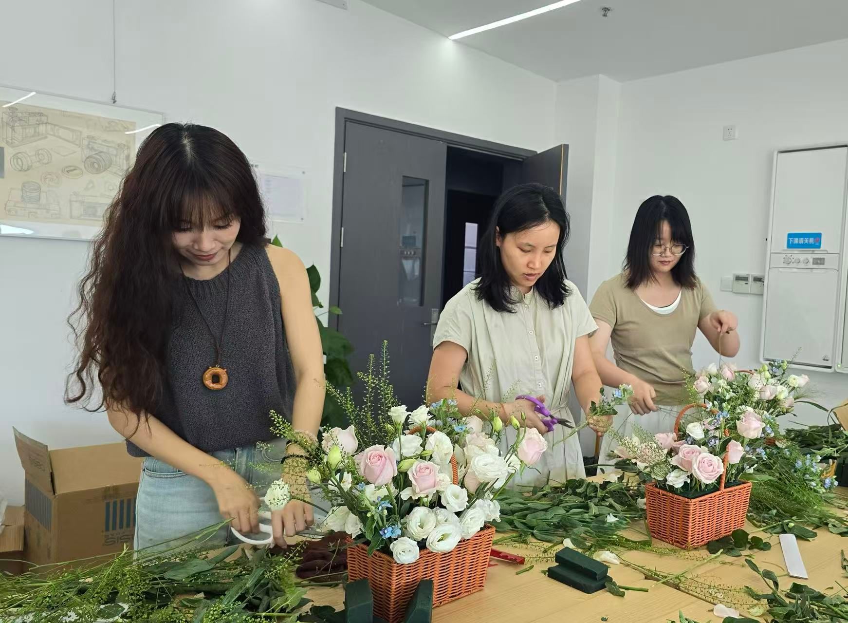 活动现场花香四溢,气氛温馨融洽。专业花艺师首先为大家介绍了花艺基础知识,包括花材识别、色彩搭配、造型技巧以及养护方法等,让参与者对插花艺术有了初步的了解与认识。在随后的实践环节中,大家在花艺师的悉心指导下,充分发挥想象力与创造力,精心挑选花材,认真修剪枝叶,巧妙构思布局,用心创作属于自己的插花作品。