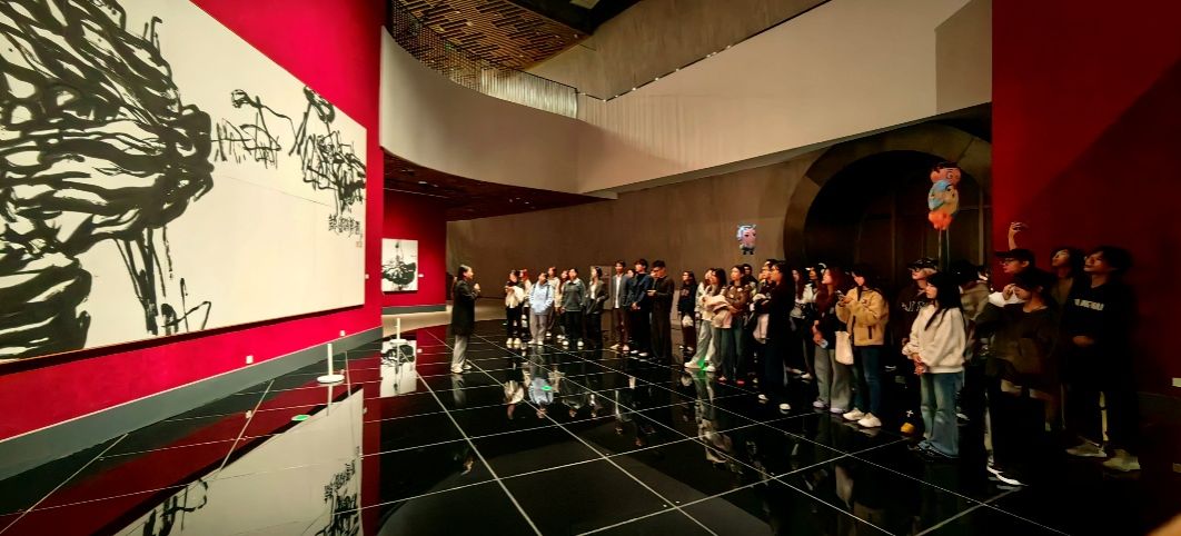 随后,师生一行前往天明湖畔的潘天寿艺术馆。这座以荷花造型为设计灵感的文化地标内,《国色年年岁岁春图》《秋酣南国图》等44件潘天寿作品静静陈列,笔墨纵横间尽显沉雄奇险、苍古高华的艺术气象。在工作人员讲解中详细解读了潘天寿先生“险中求平衡”的构图智慧与"与西方绘画拉开距离"的艺术主张,老师们针对笔墨技法、指墨艺术等专业要点进行现场指导。学子们驻足画作前,细致观摩线条的力道、墨色的层次,不时交流感悟、记录心得,在沉浸式欣赏中体悟大师"落笔大胆、点染细心"的创作精髓。