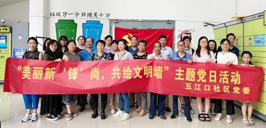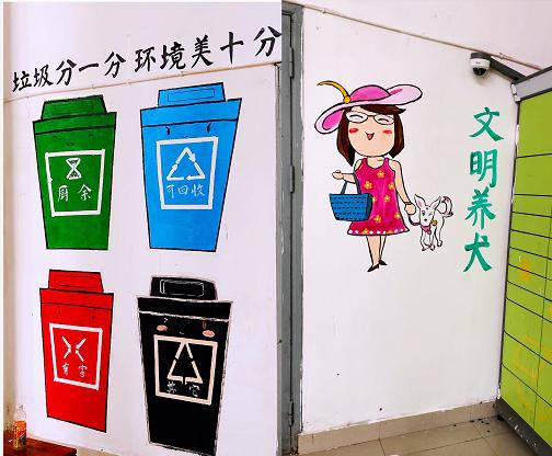下午 1 点,师生们在五江湾社区,开展义务画宣传墙绘画, 同时向在场居民宣传垃圾分类是实现垃圾减量化和资源化的重 要途径和手段; 垃圾分类回收利用处理,可以减少污染,节省资源,降低处理成本,减少土地资源的消耗,具有社会、经济、生态三方面的效益。虽然梅季环境闷热,又遇雨天,但丝毫没有减少师生党员的热情,受到在场居民的青睐。
