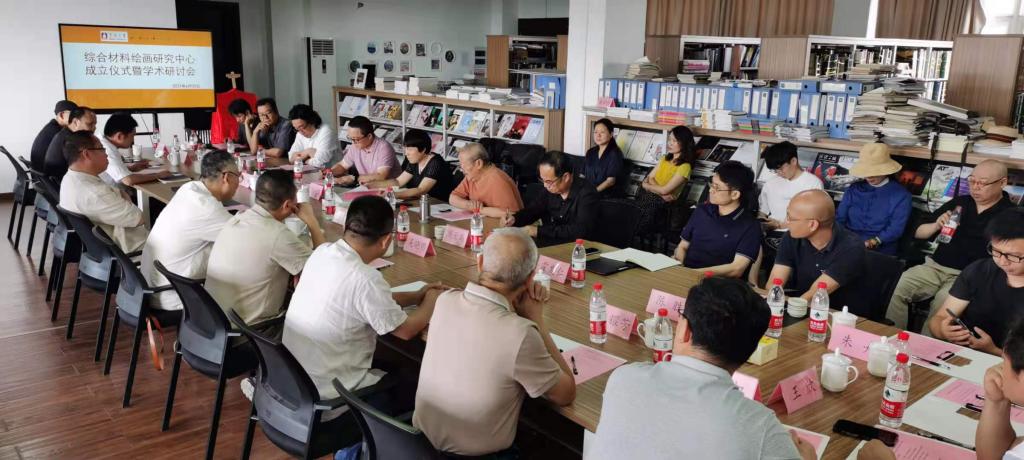 常务副院长陆海主持。首先,陆海副院长对与会嘉宾表示了热烈欢迎,并播放了中国美协综合材料绘画艺委会副主任、中国人民大学文艺复兴研究院院长丁方教授的祝贺视频,丁方教授对力举跨界创新、文化科技深度融合,适时成立科研平台表示赞赏和支持。继而,特聘院长徐仲偶教授就学院发展和研究中心成立谈了感受并提出希望、研究中心主任陈晟博士介绍了工作计划,研究生院副院长高超教授和侯吉明教授为研究中心揭牌并致辞,学术委员会主任周至禹教授为客座教授和研究员代表颁发聘书。学术研讨会由周至禹教授主持。侯吉明教授率先发言,对综合材料绘画的教学和创作提出自己的观点、李方明教授和吴晓明主任对综合材料绘画在我国的发展现状及特点进行阐释,李学峰、苏金成、魏惠东、朱启仁、邱积钏等分别从不同角度探讨了综合材料绘画创作和研究中心发展建议,并提出依托美术馆、文化馆和地方就研究拓展、资源对接等方面的合作意向,周至禹教授对专家们发言进行小结和展开。活动最后,学院党委书记徐一萍女士和特聘院长徐仲偶教授分别进行了总结性的发言。 本次活动简约而气氛热烈,在热情洋溢的欢快氛围中圆满结束。