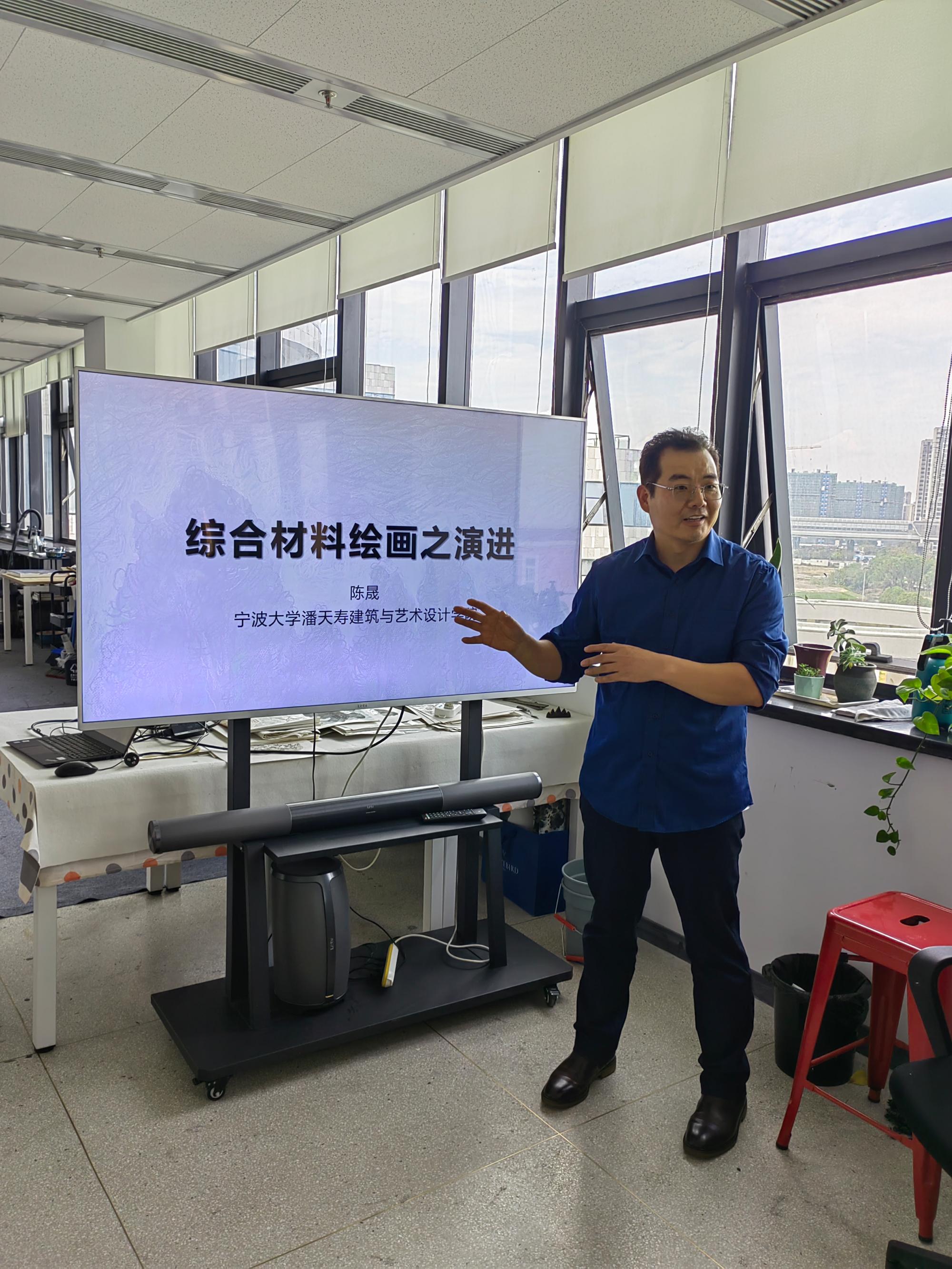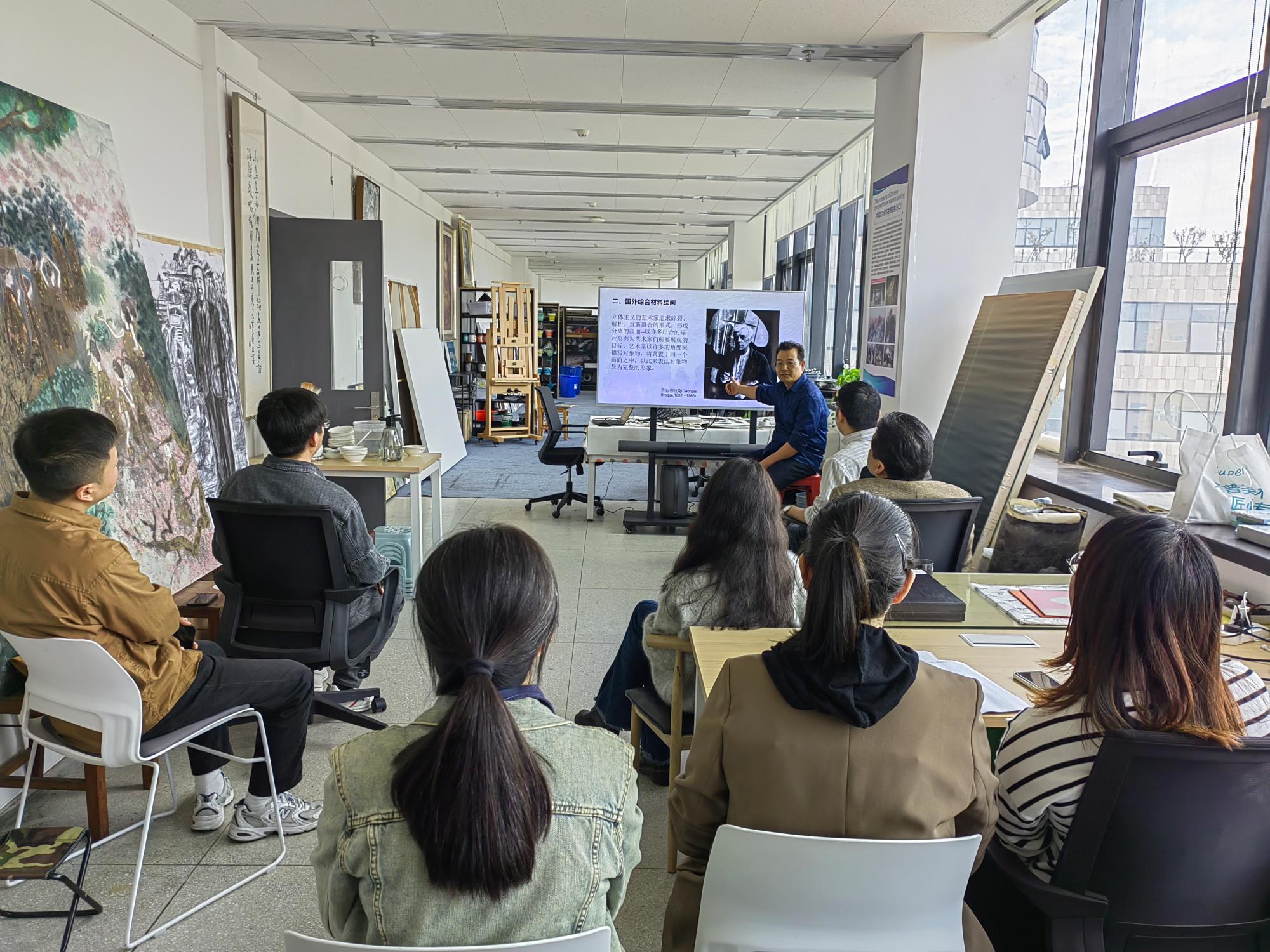 活动正式开始。陈晟博士作了主题为“中国综合材料绘画之演进”的讲座,他从综合材料绘画概述、中国综合材料绘画创作探索、综合材料绘画的中国演进趋向三方面详细介绍了综合材料绘画的总体情况、创作特点和发展趋势,通过对尚扬、胡伟、丁方、张元、胡明哲等几位艺术家作品的解析,深入浅出的带大家全面认识了综合材料绘画这一艺术形式。之后,陈老师还与参与活动的老师们在现场进行了综合材料绘画创作和深入交流。