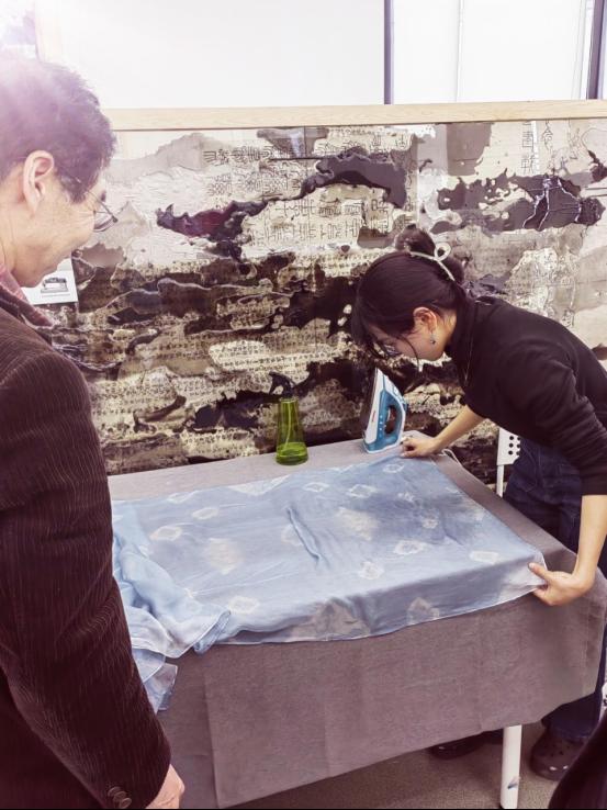 活动现场,特邀学院武会会副教授带领老师们共同体验草木染手工制作围巾,针对草木染的简要历史、技术、草木染料数量和种类等知识进行现场讲解,并结合现场染制工具进行了示范演示,随后参与活动的老师们自己动手体验了全部的草木染围巾制作过程。