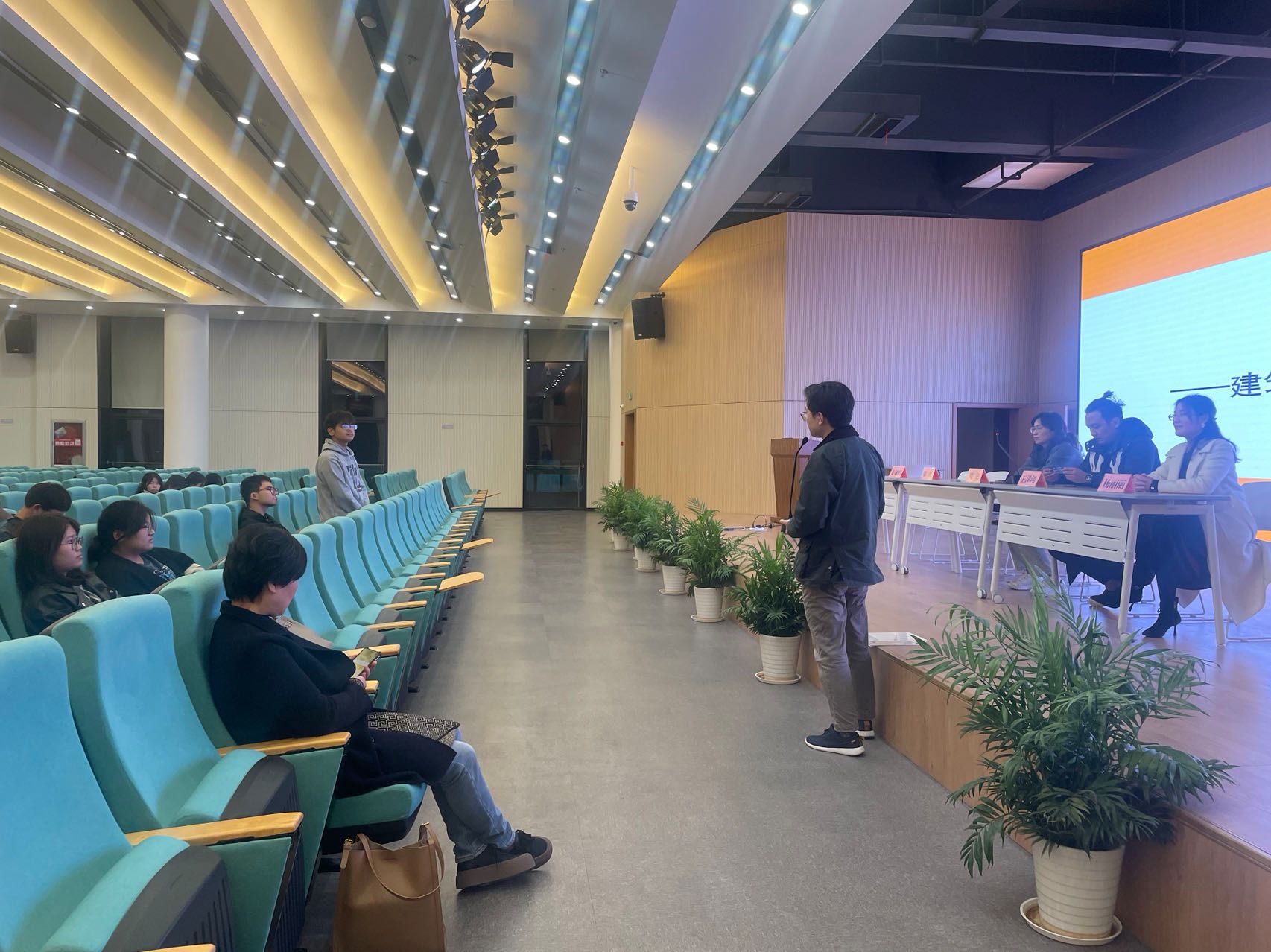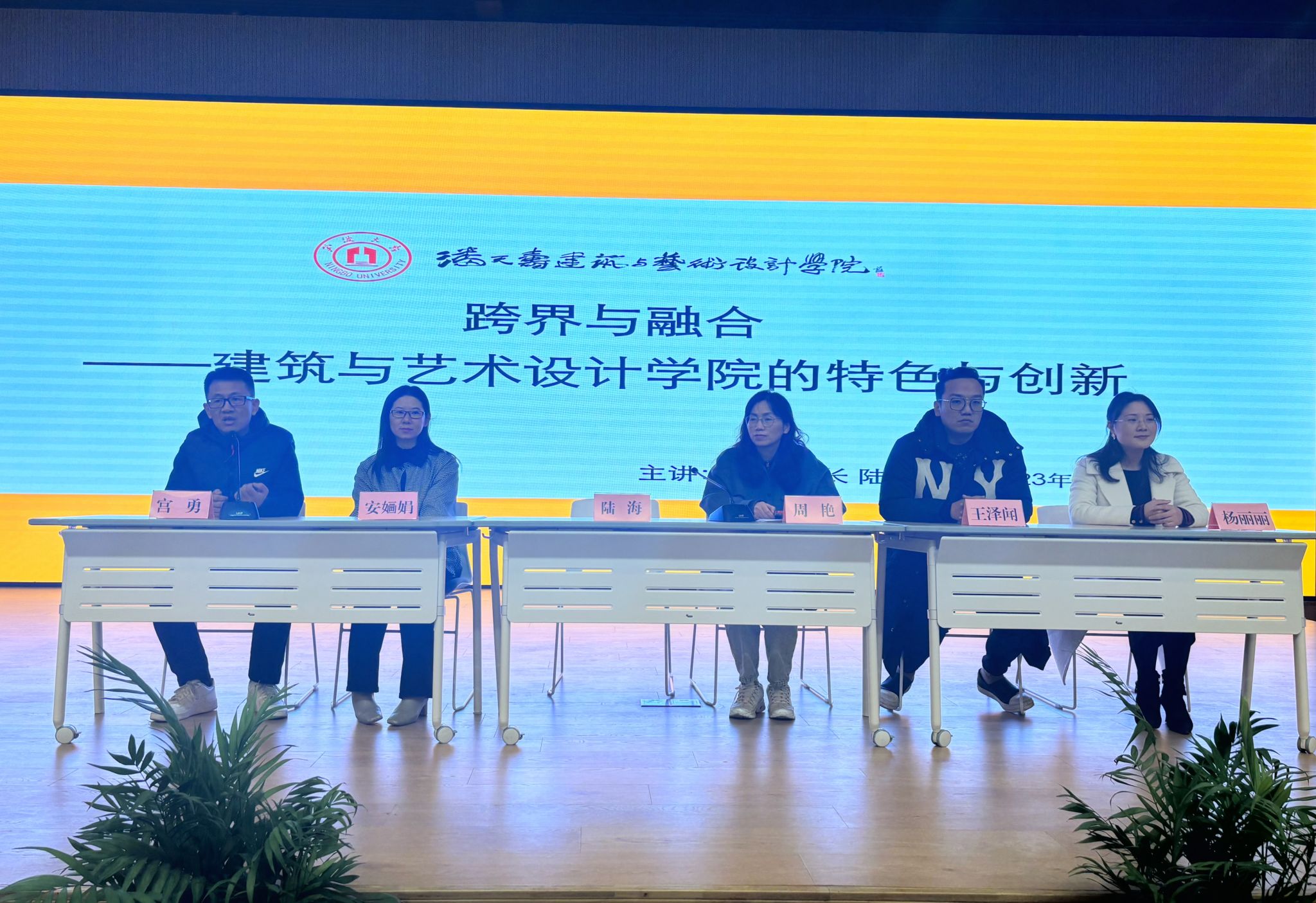 讲坛的最后,进行了答疑环节。教学副院长周艳、视传与数媒设计系系主任王泽闻、建筑系系副主任邱枫、工业设计系系副主任李忠哲与学生代表进行了面对面的交流,对学生们最关心的问题和对专业学习上的困惑给予了解答和鼓励。