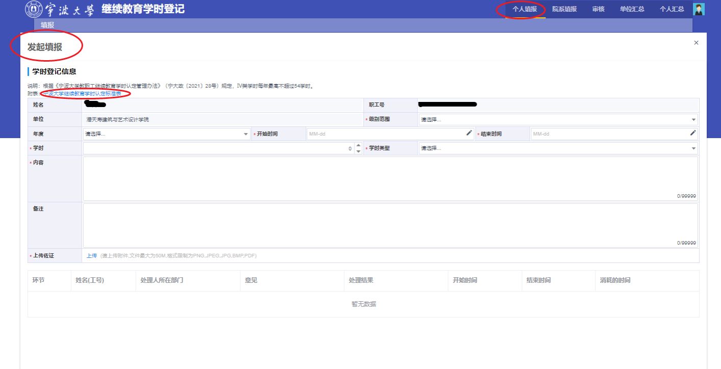 步骤5:按页面要求填入继续教育学时关键信息和添加继续教育附件(注:如学院教师本人参加线下、线上专业的讲座或研讨会等学习活动,会议签到表或线上学习活动页面不显示教师本人姓名,教师本人除提交参加线下活动的照片或线上截图外,还需提供参加讲座的学习笔记或参会发言材料等作为证明附件)
