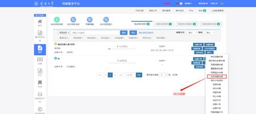 4. 进入项目组成员,请确认成员是否完整。特别是项目中有学生的参与的,请完善学生身份类别。成员信息有问题的,进入科研系统调教,左侧的项目界面,点击操作下拉框下的成员调整申请,进入成员调整界面进行添加和修改,待项目主管审核之后,会自动补充到项目经费公开一览表,最后再提交即可。