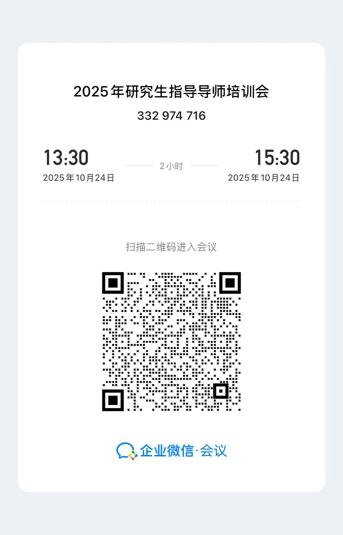 | 时间:2025年10月24日(周五)13:30 地点:院教学楼213会议室 温馨提示:校内导师须线下参会,校外导师如若特殊情况无法线下参会,可通过腾讯线上会议参会; |