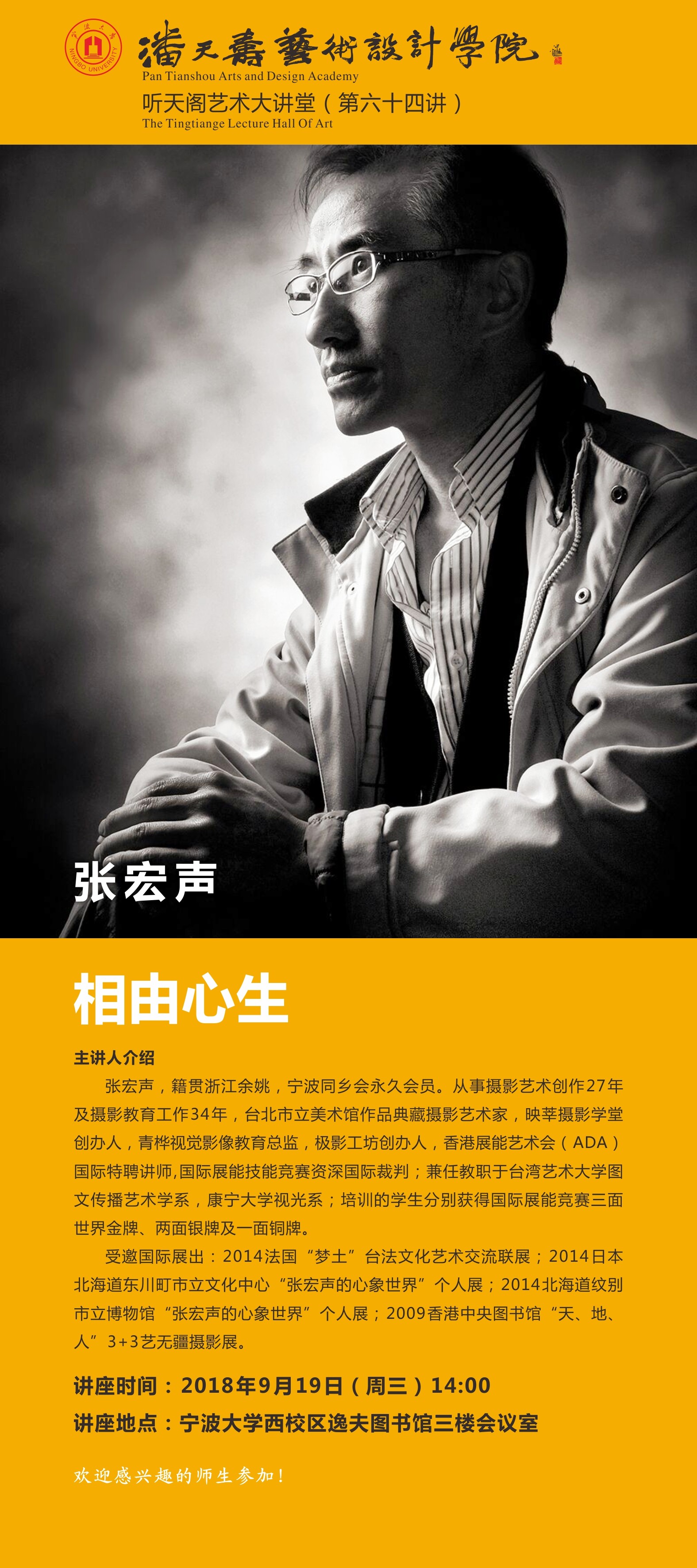 张宏声,籍贯浙江余姚,宁波同乡会永久会员。从事摄影艺术创作27年及摄影教育工作34年,台北市立美术馆作品典藏摄影艺术家,映莘摄影学堂创办人,青桦视觉影像教育总监,极影工坊创办人,香港展能艺术会(ADA)国际特聘讲师,国际展能技能竞赛资深国际裁判;兼任教职于台湾艺术大学图文传播艺术学系,康宁大学视光系;培训的学生分别获得国际展能竞赛三面世界金牌、两面银牌及一面铜牌。