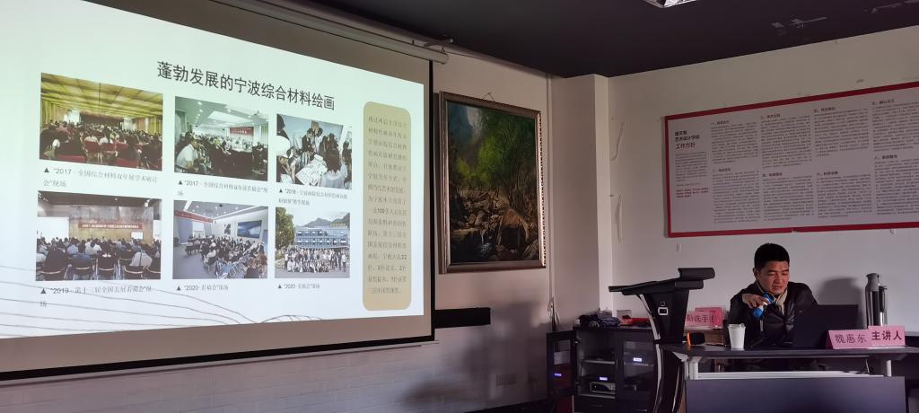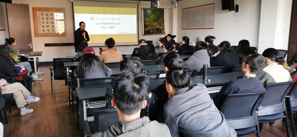 3月22日下午,宁波美术馆副馆长、一级美术师魏惠东应邀来我院进行学术交流,活动分为学术讲座和教学与创作指导两个主题。魏惠东不仅是当今我国综合材料绘画领域具有代表性的艺术家,而且在专业推广方面做了大量切实有效的工作,不断为推动宁波乃至全国综合材料绘画创作和研究发展而努力。魏惠东在讲座中分享了我国综合材料绘画的发展历程、国内外综合材料绘画不同时期具有代表性的艺术家作品,对宁波综合材料绘画创作和展览等相关内容经行了系统介绍,特别是在互动交流环节分享了他多年来系列作品的创作过程,为在场的师生提供了直接的艺术家案例。讲座活动结束后,部分师生陪同魏惠东一行到综合材料绘画教室,了解教学和课程并提出建议。
