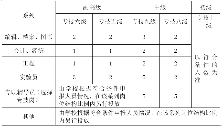 (二)其他专业技术岗位等级晋升竞聘名额:在上级核定的岗位控制结构范围内进行名额投放,具体名额分布如下: